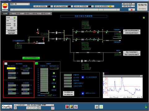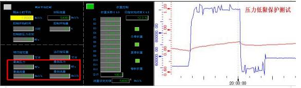 紅色區域為剩余平均流量控制的中控HMI畫面,主要內容包括啟用/停用狀態、今/明兩日日指定錄入、啟用條件輸入、壓力/流量限值、計算流量和真實流量、壓力/流量趨勢等。