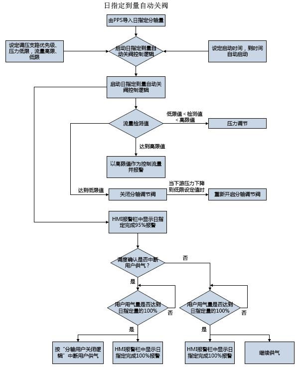 日指定到量自動關閥控制邏輯,在間斷供氣用戶使用,程序控制當日日指定到量后自動關斷調節閥門,第二日早8:00后,根據下游壓力或設定時間為判斷條件,并按照提前設定的調壓支路優先級、壓力、流量啟動用戶分輸。